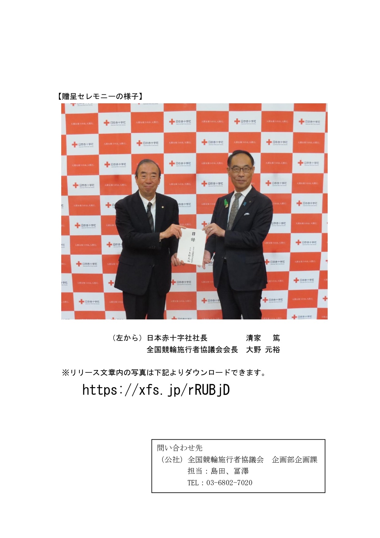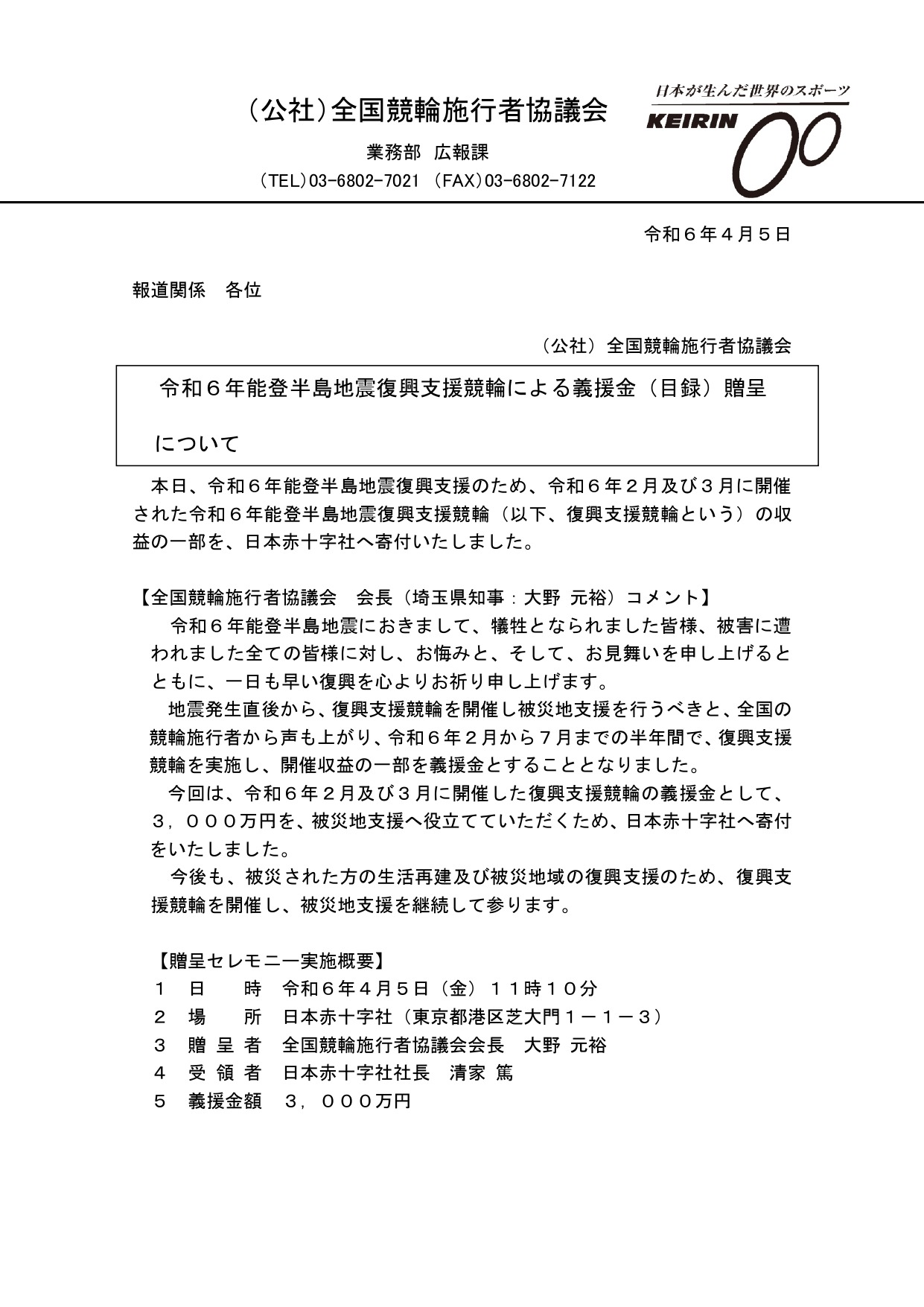 令和6年能登半島地震復興支援競輪による義援金(目録)贈呈について 2024-04-08 04:25:53 UTC 令和6年能登半島地震復興支援のため、令和6年2月及び3月に開催された令和6年能登半島地震復興支援競輪(以下、復興支援競輪という)の収益の一部を、日本赤十字社へ寄付いたしました。 リリース文書について、以下よりご参照ください。